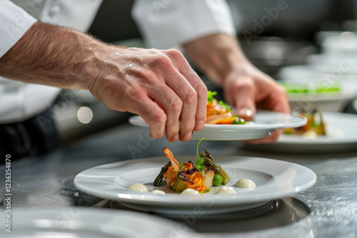 close up horizontal image of a fine dining chef finishing to decorate a dish