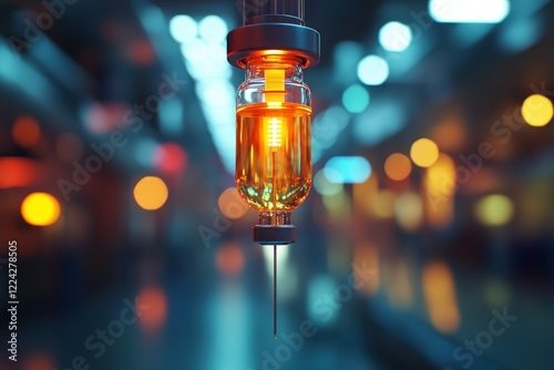 Close Up IV Drip in Hospital Room with Saline Bag and Warm Ambient Lighting