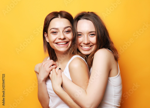 Close up lifestyle portrait of two pretty teen girlfriends smiling hugs and having fun