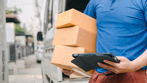 Close up logistic worker delivering cardboard boxes to recipient at home door.