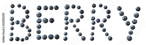 Close up, macro. Blueberry. Concept. Dark blue berries laid out the inscription berry. Isolated on a white background.