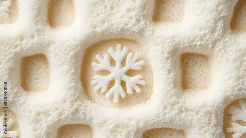 Close up macro photo of a snowflake decor on a sponge cake surface. Winter themed confectionery. Detailed image in light ivory color.