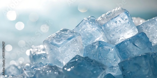 Close up macro shot of clear ice cubes with water droplets and sparkling light reflections on a cool blue background