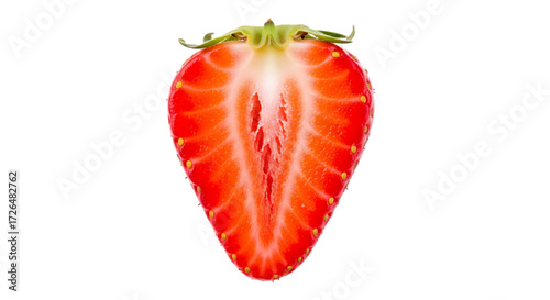 Close up macro view of a fresh ripe strawberry cut in half showing internal texture and seeds isolated on transparent background