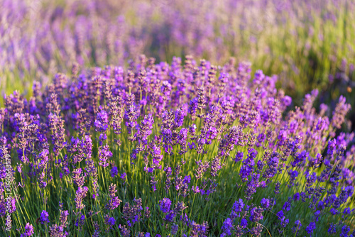 Close up, macro view of vibrant purple lavender flowers in soft evening sunlight. Golden light, delicate texture and fragrant essence of blooming plants in full summer. Natural background, lanscape