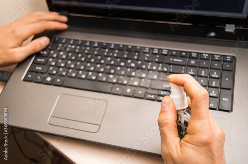Close up. Male hand disinfect the laptop keyboard.