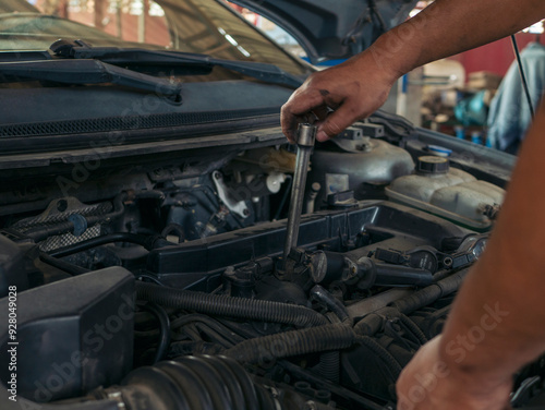 Close up Man hands fixing Car machinery vehicle mechanical service. Mechanic man hands repairing car auto repair shop. open vehicle hood checking up auto mobile. Vehicle Car maintenance engineer.