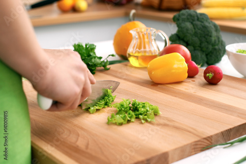 Close up of woman's hands cooking in the kitchen. Housewife slicing white bread. Vegetarian and healthily cooking concept