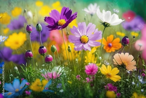 Close Up of a Beautiful, Colorful Flower Meadow With Blurred Flowers in the Background - Generative AI