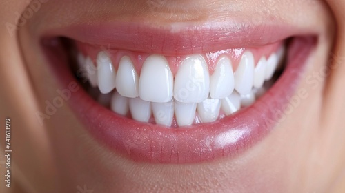 Close up of a beautiful smile with shining white teeth. Healthy beautiful female smile. Teeth health, whitening, prosthetics and care. AI