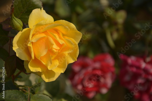 Close up of a beautiful yellow with green leaves shade Rose, Rosa blooming in a garden of West Bengal, India, selective focusing