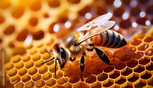close up of a bee on honeycomb showcasing the intricate details of its body and the hexagonal structure of the hive around it