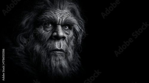 Close up of a bigfoot or sasquatch face with a serious expression in dark lighting