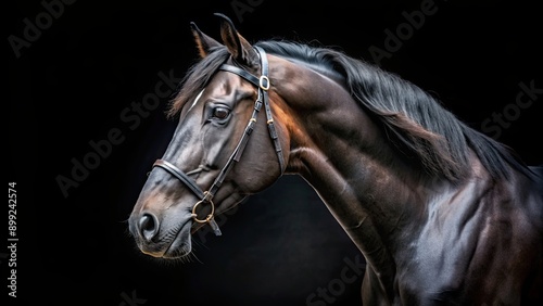 Close up of a black horse head with contrast lighting against a black background, black, horse, head, close up, contrast lighting