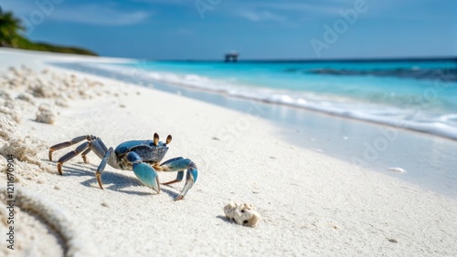 Close Up of a Blue Crab on a Tropical Beach, Minimalist Scene with White Sand and Clear Blue Water