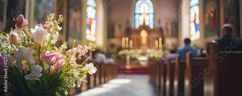 Close up of a bouquet of flowers in the interior of a church with people listening to mass. Holy Week concept.