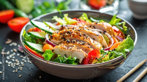 Close up of a bowl on the table containing a chicken salad with fresh vegetables and sesame seeds in a horizontal composition