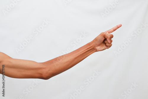 Close Up Of A Brown Skin Hand Pointing Right Against A Clean White Background
