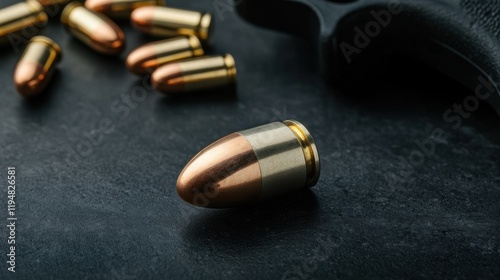 Close up of a Bullet on a Dark Surface with Handgun in Background