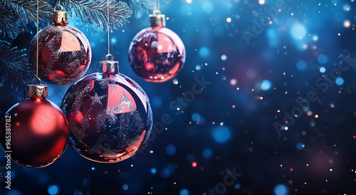 Close up of a christmas red balls decorations and christmas tree branches background with snow and warm twinkle lights