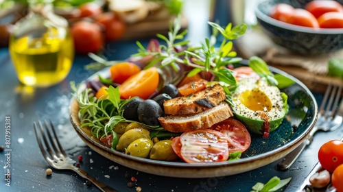 Close up of a colorful plate of various French foods including Nicoise Salad