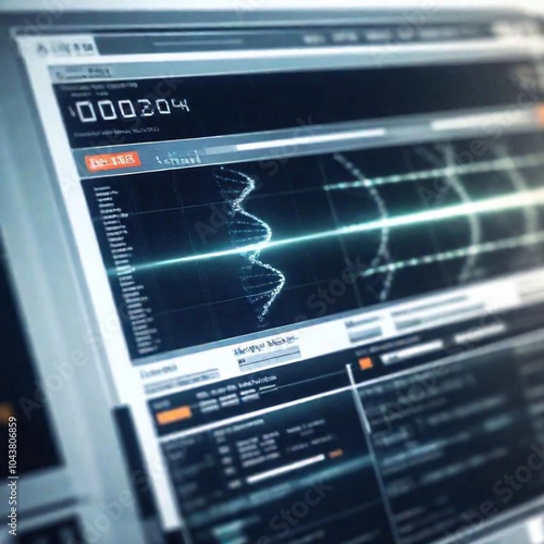 Close Up of a computer screen displaying a digital model of DNA, with tilt-shift effect to focus sharply on the DNA sequence while blurring the surrounding interface.