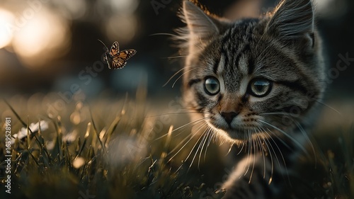 Close up of a curious tabby kitten's face looking at a butterfly in tall grass during golden hour