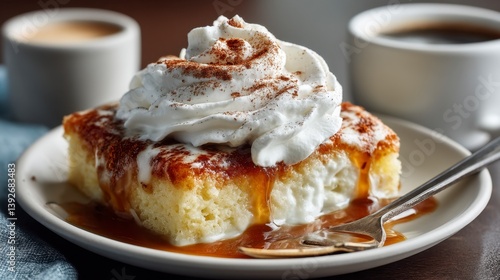 Close up of a decadent dessert a light colored cake topped with fluffy whipped cream and a caramel sauce, served on a white plate alongside cups of coffee.