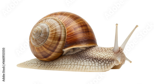 Close up of a detailed snail with a spiraled shell isolated on white background