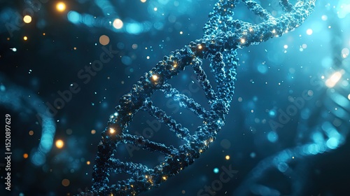 Close up of a dna strand with a dark blue background and bokeh lights creating depth of field