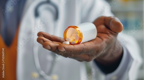 Close up of a doctor pouring prescription medicine pill from prescription pill bottle on hand, concept of stop drug, medication caring, healthy care.