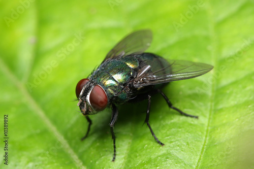 Close up of a fly standing on green leaf.