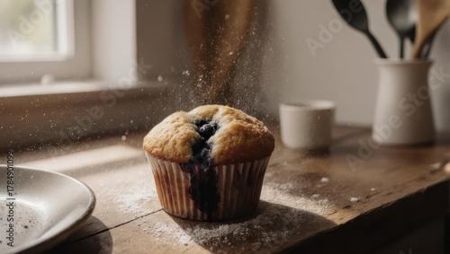 Close up of a freshly baked blueberry muffin dusted with powdered sugar on a wooden table.