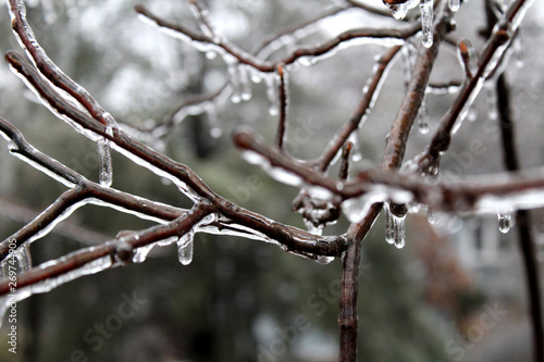 Close up of a frozen twig in ice