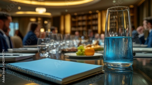 Close up of a glass of water on a table in a meeting room with blurred background of business people.