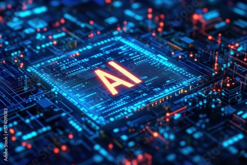 Close up of a glowing ai symbol on a blue circuit board with red lights and intricate connections