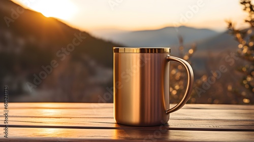 Close up of a gold Mug on a wooden Table in the Mountains. Blurred natural Background