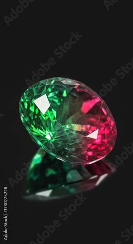 Close up of a green and pink watermelon tourmaline gemstone. Reflection of jewel on dark table, luxury background.