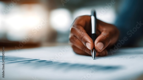 Close up of a hand holding a pen writing on a document in a professional setting