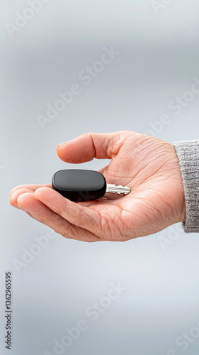 Close up of a Hand Holding a Small Black Oval Object Against a Gray Background