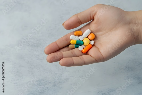 Close up of a hand holding various colorful pills or capsules