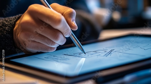Close up of a hand using a stylus to sketch on a digital tablet.