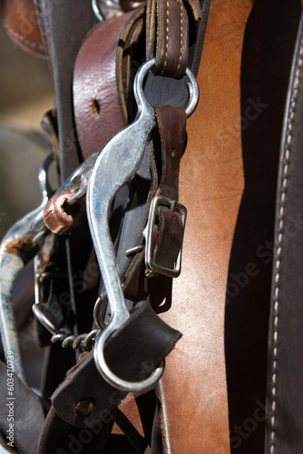 Close up of a horse bridle and bit. Vertical shot.