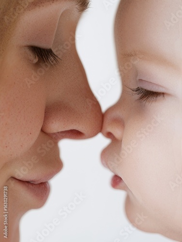 Close up of a man and a child touching noses, symbolizing a deep bond and parental love. Concept of family care for nursery.