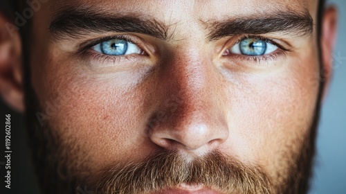 Close up of a man with a well-groomed beard and striking light blue eyes reflecting a thoughtful and contemplative expression.