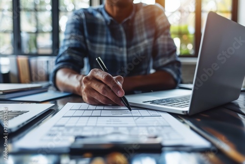 Close up of a man's hand holding a pen and filling in check marks on a to-do list or promotion plan on a virtual laptop screen, business ideas concept with a human working using online technology.
