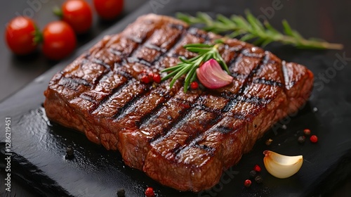 Close up of a perfectly grilled juicy steak with fresh rosemary and garlic cloves served on a dark slate plate The savory seasoned meat is the centerpiece of this gourmet appetizing dish