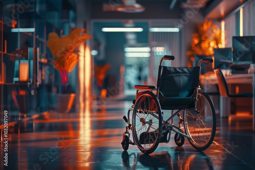 Close up of a person in a wheelchair in a office environment