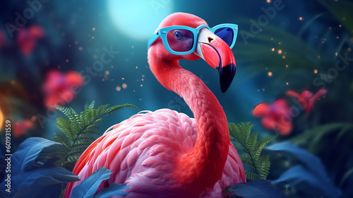 close up of a pink flamingo wearing sunglasses, flamingo in jungle. Generative AI