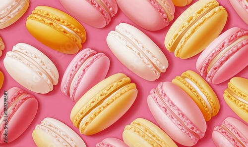 Close up of a pink, yellow, and white macaron. The macarons are arranged in a pattern on a pink background